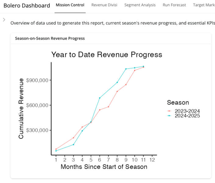 If you track who bought what ticket and whenâyouâre sitting on a goldmine of behavioral insights.Bolero turns your raw data into clear, easy-to-share visuals that answer essential questions like:- How are we performing this season versus last?